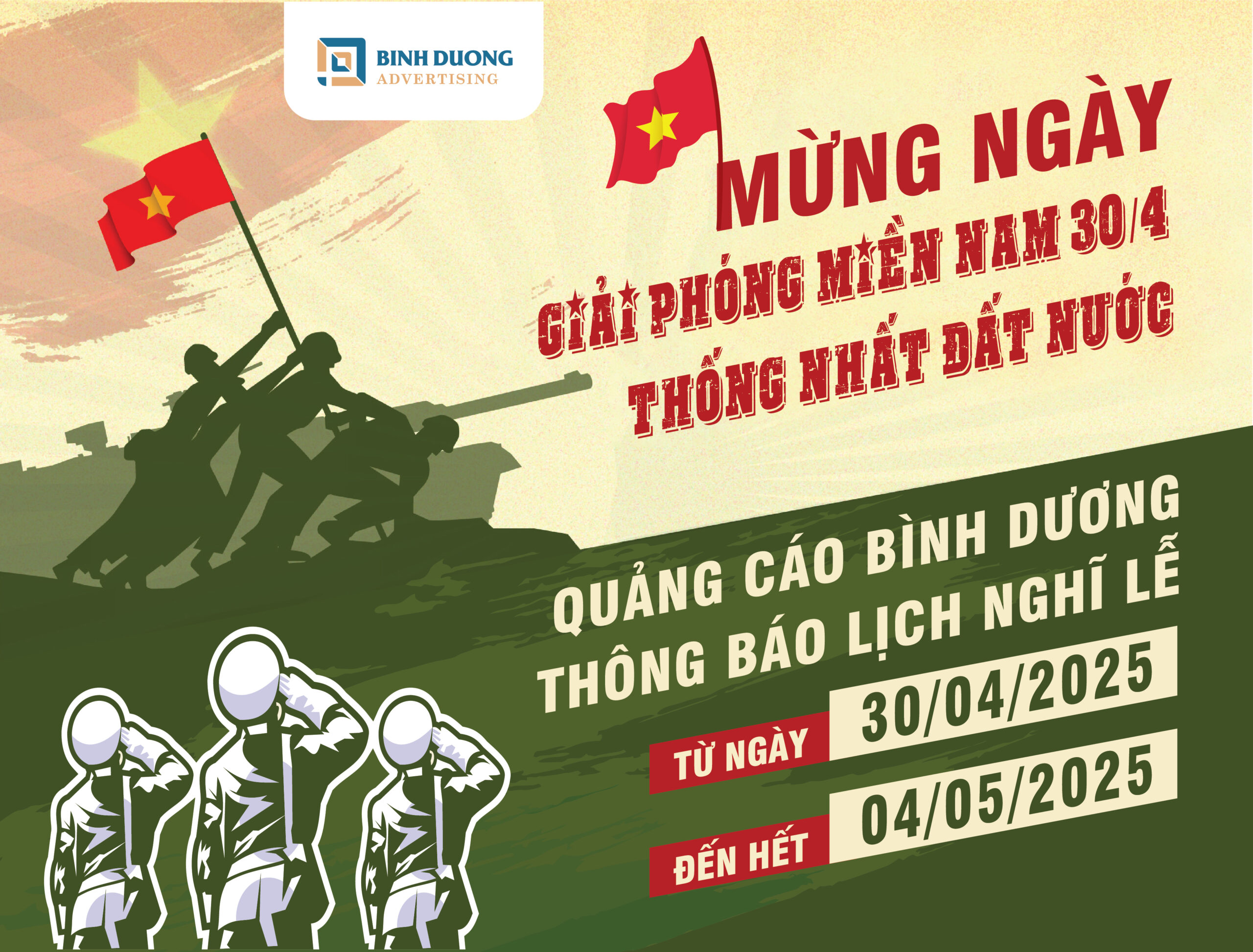🇻🇳 Hoà trong không khí tri ân ngày lễ lớn của dân tộc, Quảng Cáo Bình Dương xin trân trọng gửi đến Quý Đối tác, Khách hàng lịch nghỉ lễ 30/4 & 1/5 như sau: